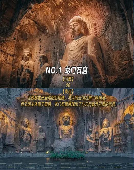 特色:自北魏时期都城迁至洛阳后开始建设,龙门石窟与大同的云冈石窟存在一定渊源,但由于其主体建于盛唐时期,展现出与云冈截然不同的艺术风格。