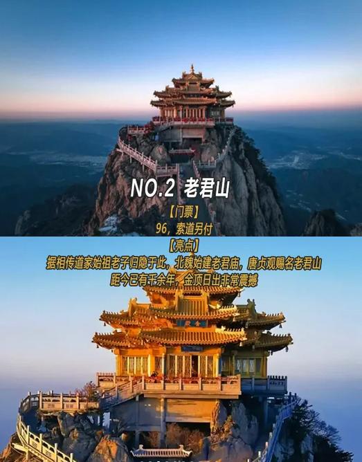 特色:据说道家始祖老子曾在此隐居,北魏时期建立了老君庙,唐代贞观年间被命名为老君山,至今已有千年历史,金顶日出的景象令人震撼。