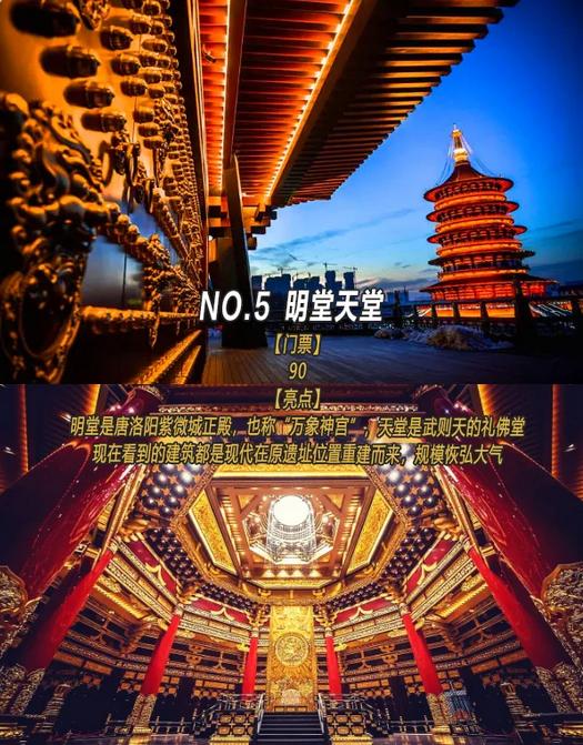 特色:明堂是唐代洛阳紫微城的主殿,亦称“万象神宫”,而天堂则是武则天的礼佛之地。如今所见的建筑均为现代在原址基础上重建,气势恢宏。