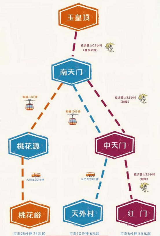 🟢最轻松的选择:从玉皇顶出发,乘坐南天门索道(约10-15分钟)后,搭乘中天门大巴车(约20分钟)到达天外村游客中心。