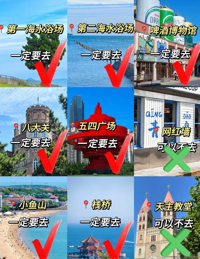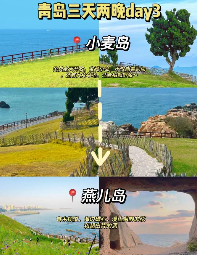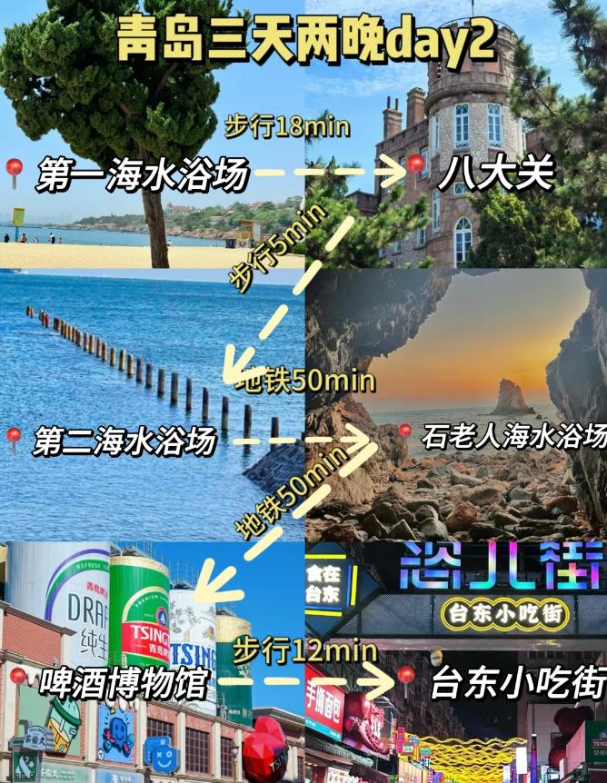 第二天:第一海水浴场➡️八大关➡️第二海水浴场➡️石老人海水浴场➡️青岛啤酒博物馆➡️台东步行街第三天:➡️小麦岛➡️燕儿岛
