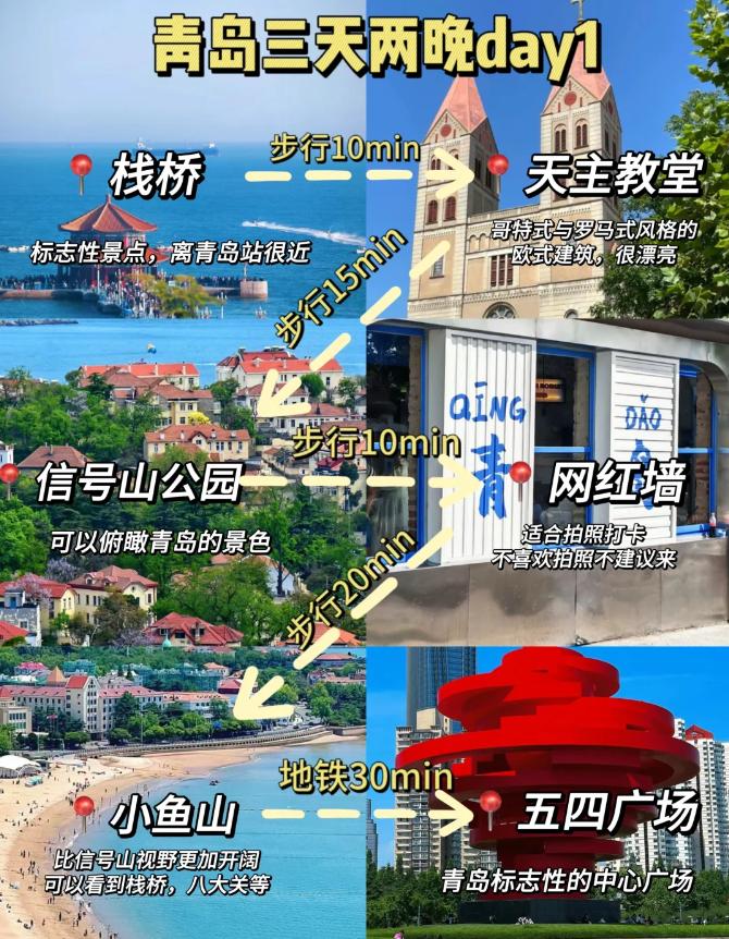 第一天:栈桥➡️天主教堂➡️信号山公园➡️网红墙➡️小鱼山➡️五四广场