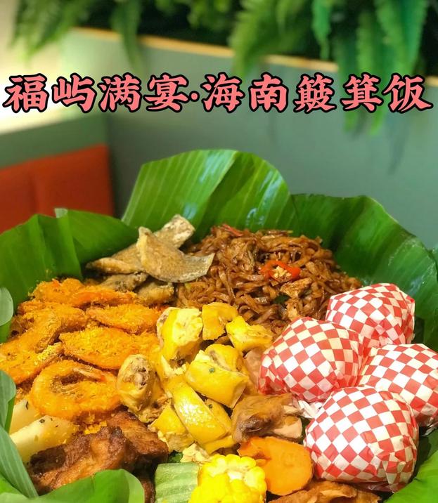 ✅ 福屿满宴·海南簸箕饭🍱:一份簸箕饭包含多种海南特色美食,如文昌鸡、藤桥排骨和避风塘炒海虾等,非常适合与朋友分享。