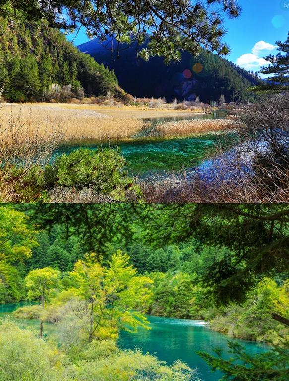 ↗️右侧——日则沟:这里的精华景点数量多于左线,包括原始森林(冬季关闭)、箭竹海、熊猫海、五花海、珍珠滩瀑布和镜海等;