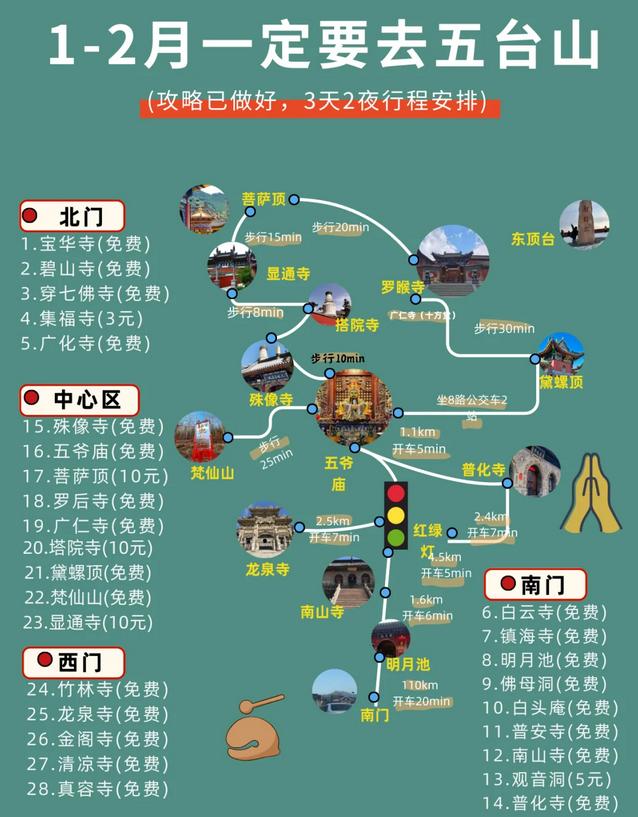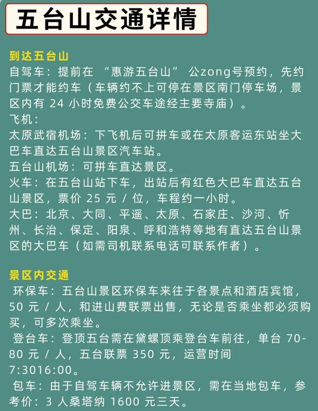 🔸前往五台山时,自驾游客需留意路况,冬季可能因降雪导致部分道路通行困难。若使用公共交通,建议提前制定中转路线和时刻表。