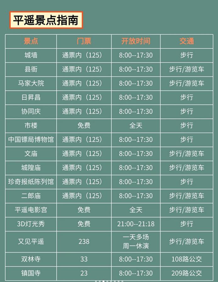 🔺平遥古城及双林寺、镇国寺的冬季开放时间为8:00至17:30,由于闭馆时间较早,建议安排2-3天的游览时间以便充分体验这些景点。