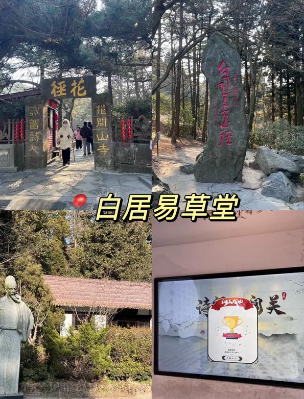 📍花径:白居易在被贬为江州司马期间选择在庐山隐居,并建造了这座草堂。园内有“白居易草堂陈列室”和白居易的石像,矗立在湖边。花径亭上刻有“花径”二字,传说是白居易的亲笔所写。