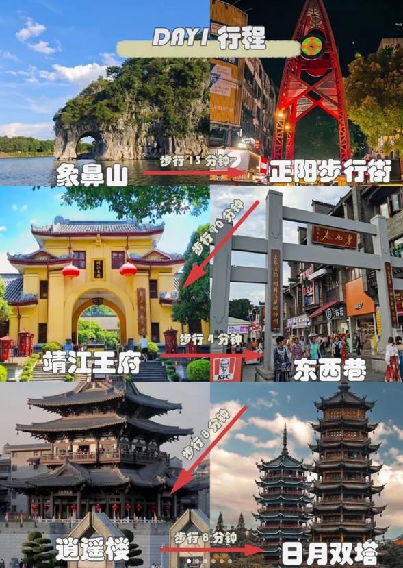 3️⃣靖江王府:这是明朝靖江王的府邸,保留了许多明代的建筑遗迹。在这里可以体验古代科举考试的情景。独秀峰也在景区内,建议爬山观赏周围的美景。