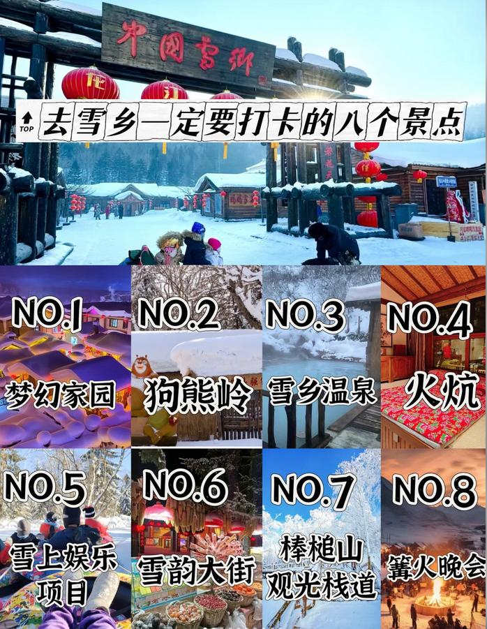 雪乡的必游景点(如雪韵大街、梦幻家园、棒槌山观景栈道、雪上娱乐活动、雪地温泉、篝火晚会和狗熊岭)👉