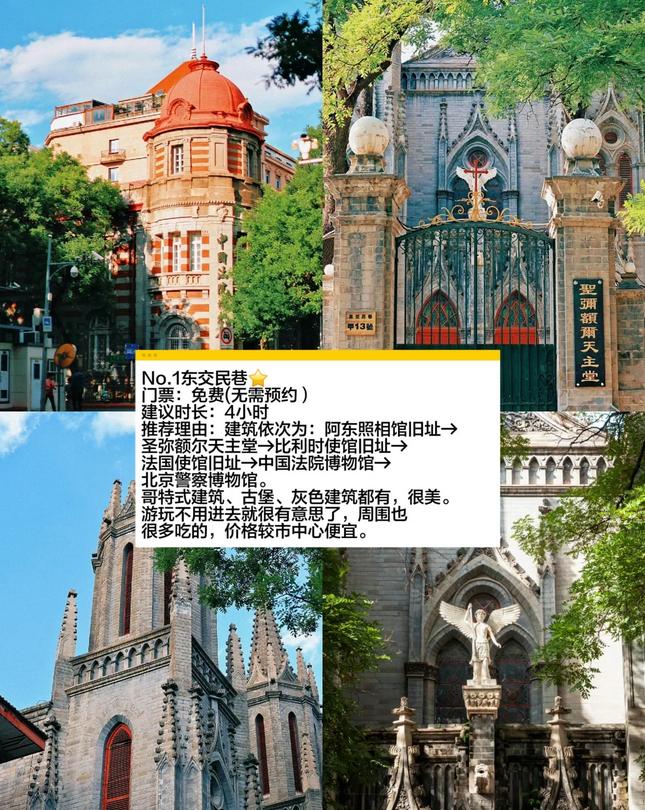推荐理由:沿途可见的建筑有:阿东照相馆旧址、圣弥额尔天主堂、比利时使馆旧址、法国使馆旧址、中国法院博物馆以及北京警察博物馆。这里的哥特式建筑、古堡和灰色建筑都十分迷人。即使不进入这些建筑,周围的环境也相当有趣,附近还有许多餐饮选择,价格相对市中心更加实惠。