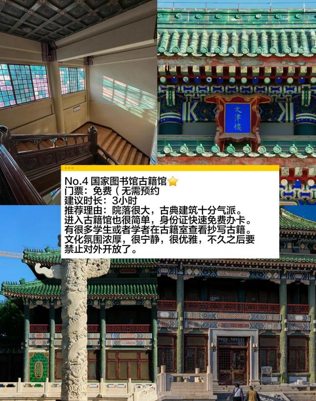 推荐理由:这个地方的院落非常宽敞,古典建筑也十分壮观。进入古籍馆的过程很简单,只需用身份证快速办理免费卡片。许多学生和学者在古籍室中查阅和抄写古籍,浓厚的文化氛围让这里显得宁静而优雅。(更新:自2024.4.2已闭馆)