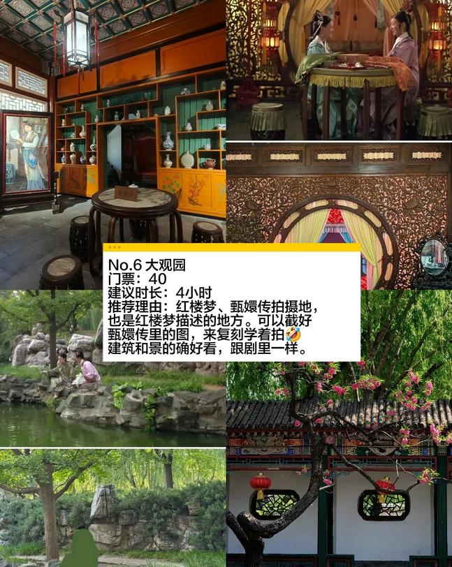 推荐理由:这里是《红楼梦》和《甄嬛传》的拍摄地,也是《红楼梦》中描绘的场所。可以拍摄一些《甄嬛传》的经典场景,尝试复刻那些镜头。建筑和景色都非常迷人,跟剧中展现的一样。