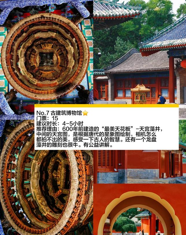 推荐理由:这里有600年前建成的“最美天花板”——天宫藻井,其中心的天宫图是依据唐代星象图绘制的,实物之美难以用相机捕捉,令人感受到古人的智慧。此外,龙盘藻井的雕刻也极为精美,提供公益讲解。