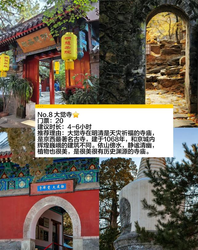 推荐理由:大觉寺在明清时期是为天灾祈福的庙宇,是京西最著名的古寺,始建于1068年。与京城内的宏伟建筑不同,这里依山傍水,环境宁静优雅,周围的植物也十分美丽,是一处历史悠久且极具美感的寺庙。