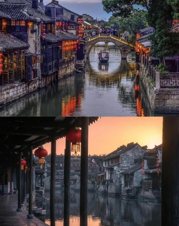 🔺建议傍晚时分乘坐乌篷船,灯光亮起后欣赏西塘的夜景非常迷人,同时也能欣赏到古镇的夕阳。