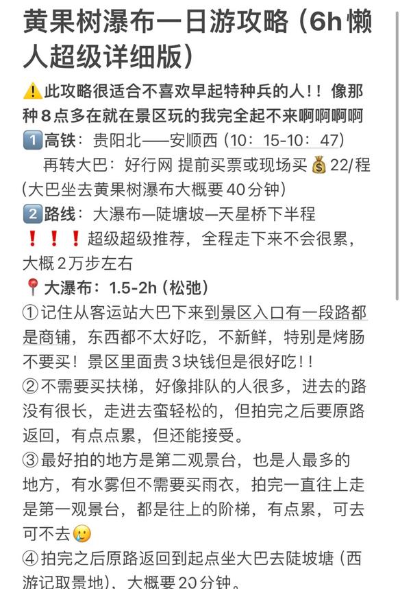 1. 高铁:贵阳北到安顺西(10:15-10:47),之后换乘大巴:通过好行网提前购票或现场购票💰22/程(大巴前往黄果树瀑布大约需要40分钟)。