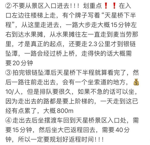 ②切勿从景区入口进入!!!重点强调❗❗在入口左侧的楼梯上走,有一个标识写着“天星桥下半程”,从这里进入后,沿路快速行走大约15分钟即可到达水果摊。然后从水果摊向左继续走到麦当劳,那里才是真正的起点,接下来还需走2.3公里才能到达银链坠潭。如果步伐快的话,大约需要20分钟。