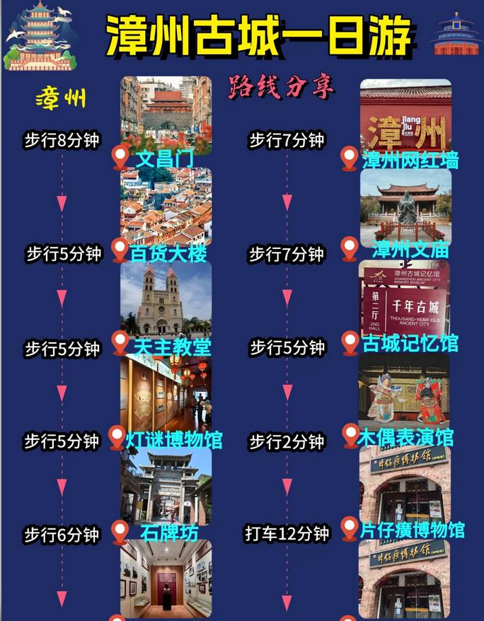 文昌门➡百货大楼➡天主教堂➡灯谜博物馆➡石牌坊➡杨骚文学馆➡漳州网红墙➡文庙➡古城记忆馆➡木偶表演馆➡片仔癀博物馆➡漳州博物馆 🌈 交通信息: