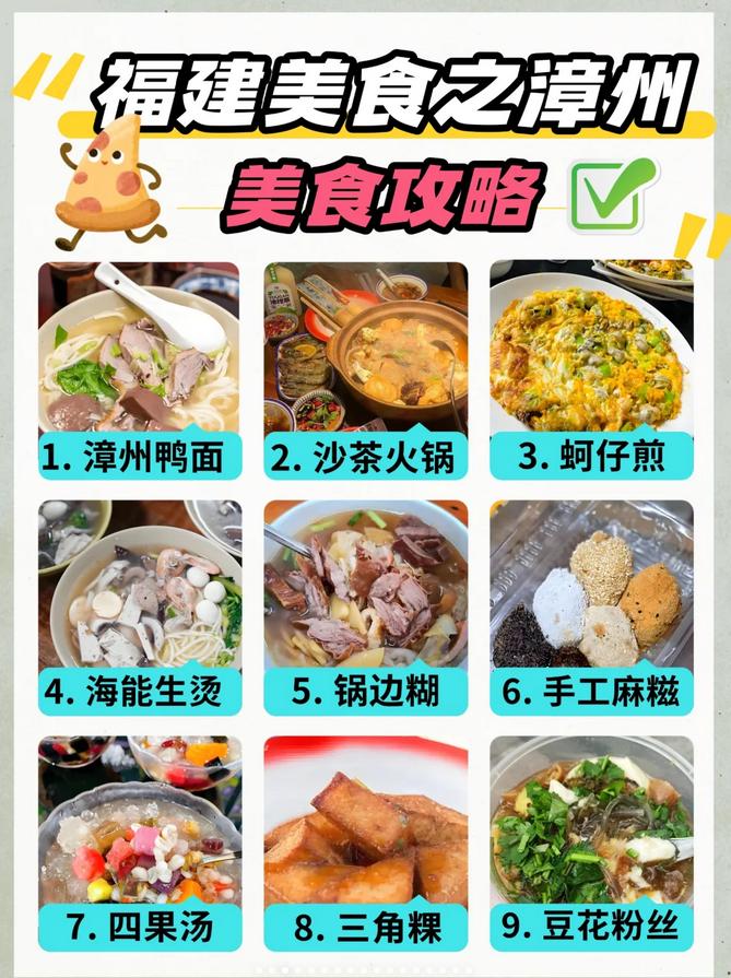 😋美食:推荐尝试漳州鸭面、海能生烫、锅边糊、四果汤、沙茶火锅、老国三角粿、蚵仔煎、白水贡糖、猫仔粥、五香卷、麻糍、鸡仔胎、面煎粿等