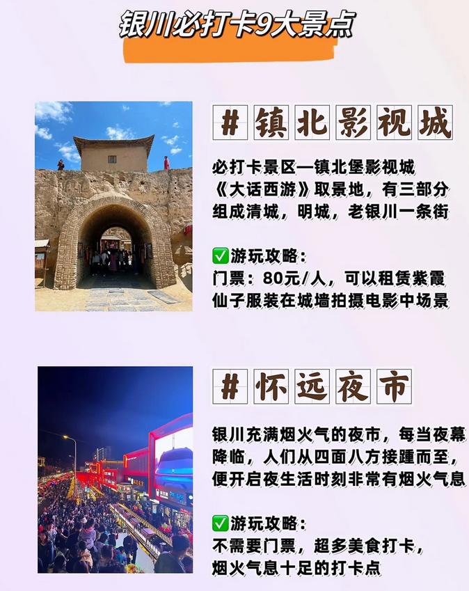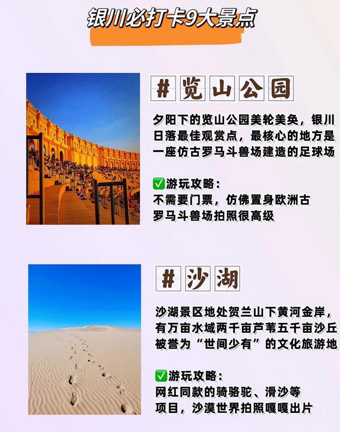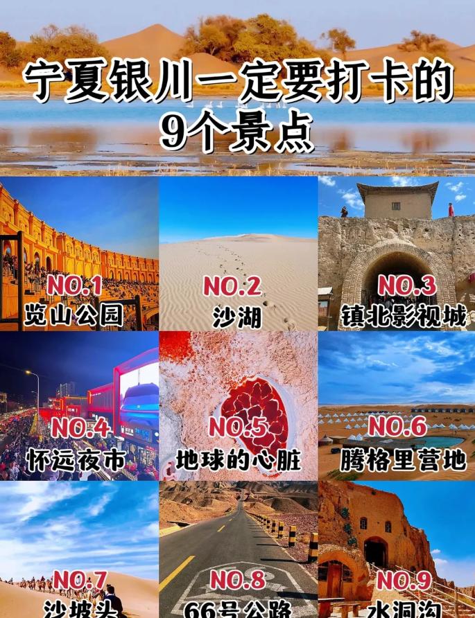 如果你计划前往宁夏银川,却不知该去哪些地方游玩,这里为你推荐9个必去的景点,包括览山公园、沙湖、镇北影视城、怀远夜市、地球的心脏、腾格里营地、沙坡头、66号公路和水洞沟。