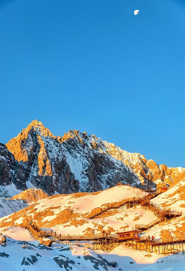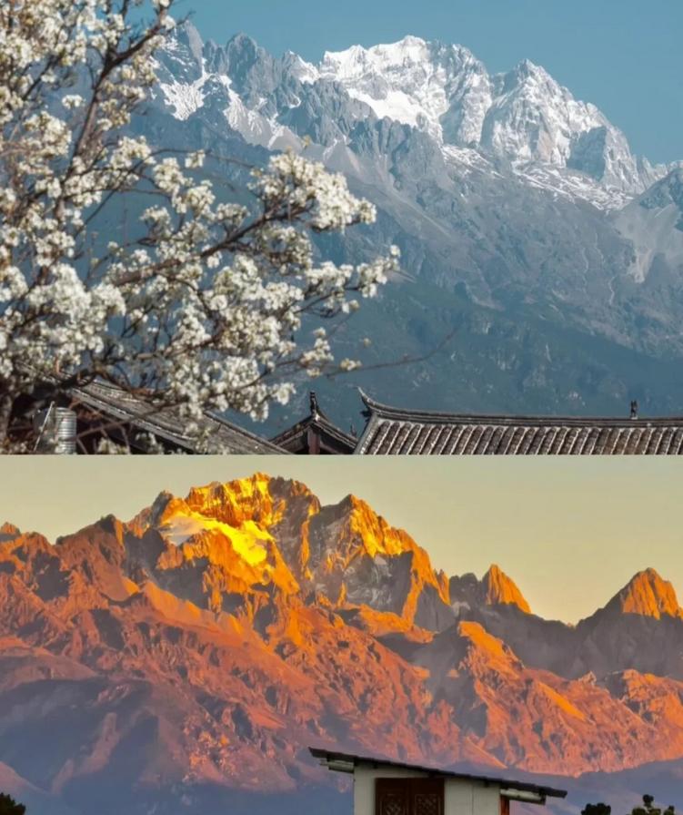 🌇黄昏时分,夕阳西沉,金色渐渐转为火红,玉龙雪山仿佛被烈焰包围,展现出截然不同的壮丽。这样的色彩变化,宛如大自然的调色板,令人惊叹。