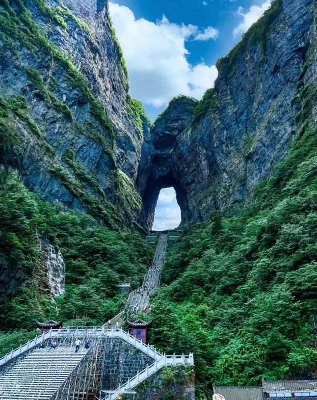 首先乘坐长索道上山,游览山顶的东线或西线景点,接着前往天门洞,挑战999级台阶,最后通过短索道下山。