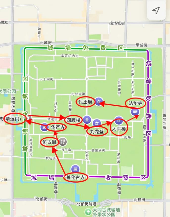 🅰️Day1 从大同南站出发,途经善化寺、仿古街、华严寺、清远门、四牌楼、九龙壁、太平楼、法华寺、代王府,最后到达云冈石窟。