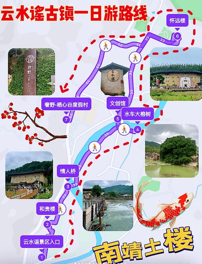 👣 步行路线:从云水谣景区入口出发➡️和贵楼➡️情人桥➡️水车大榕树➡️文创馆➡️怀远楼
