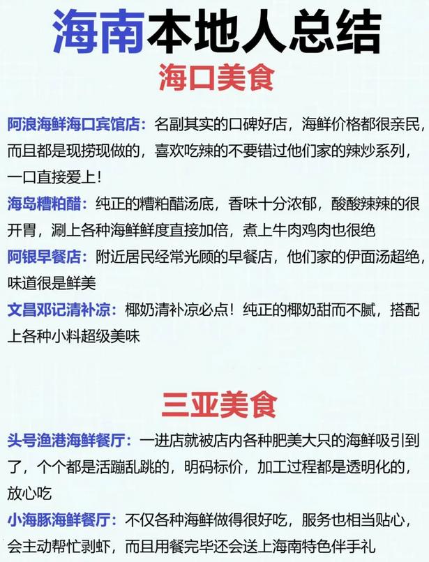 🏠小海豚海鲜餐厅:这里的海鲜不仅美味,服务也十分周到,工作人员会主动提供剥虾的帮助,餐后还会赠送海南特色的小礼品。