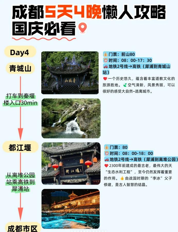 5. 建议青城山乘坐索道上山,步行下山。都江堰可以从秦堰楼入口进入,从离堆公园出口出来,避免走回头路🚶🏻♀️!