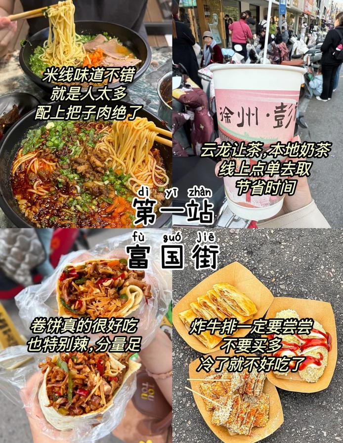 1️⃣富国街:这里是美食街,各种徐州特色美食应有尽有,强烈推荐一品飘香的米线(不过人真的很多,建议搭配把子肉),还有枣子糕、二中老郑的烤肉筋和闫婷的卷饼,味道辣得很,配上夏抱冰冰粉更佳。