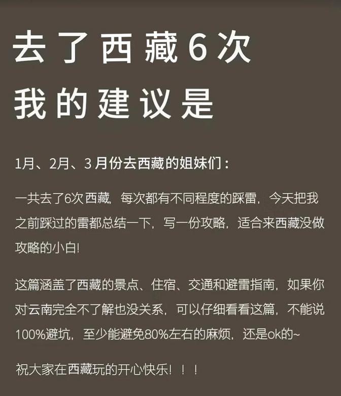 建议大家,去西藏不宜随意出发,缺乏充分准备的人可能会面临一些麻烦。结合我六次去西藏的经历,分享一些个人见解,希望能为大家的西藏之旅提供帮助,避免走弯路~