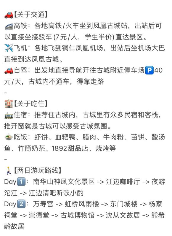 🚄高铁:可以选择乘坐高铁或火车前往凤凰古城站,出站后有接驳车(7元/人,学生半价)直接到达景点。