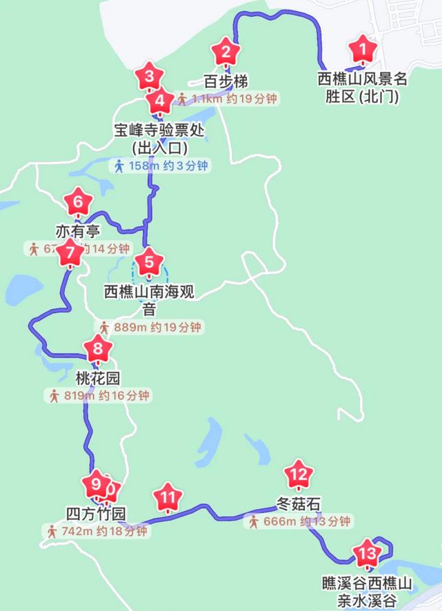 🚩徒步探索路线推荐: 路线1:北门-百步梯-观景平台-宝峰寺-观音像-亦有亭(寺边村站)-桃花园-四方竹园-九龙岩-冬菇石-亲水溪谷,预计耗时约4~5小时 路线2:北门-百步梯-观景平台-宝峰寺-观音像-亦有亭(寺边村站)-天湖公园-白云洞-三湖书院-白云古寺-奎光塔-西门,适合徒步爱好者,路程相对较长,体力消耗较大