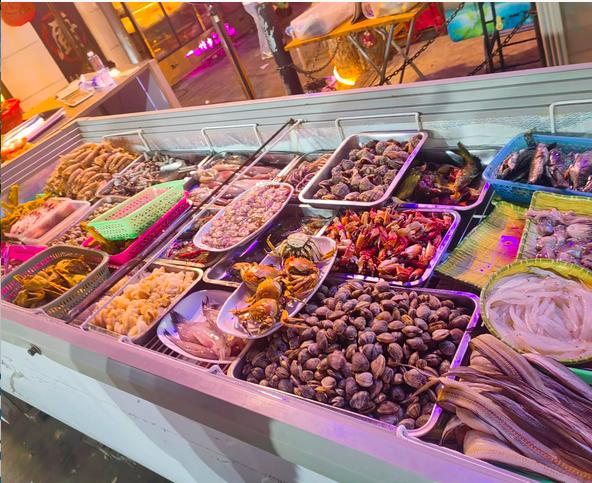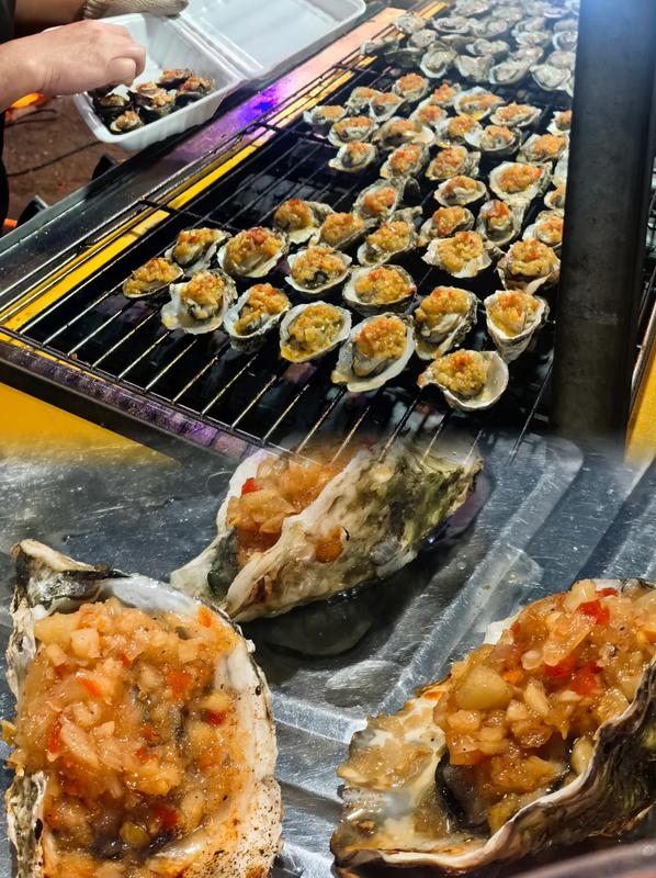 ✔️ 1元生蚝:炭烤摊随意选择!蒜蓉和辣椒圈堆成小山!