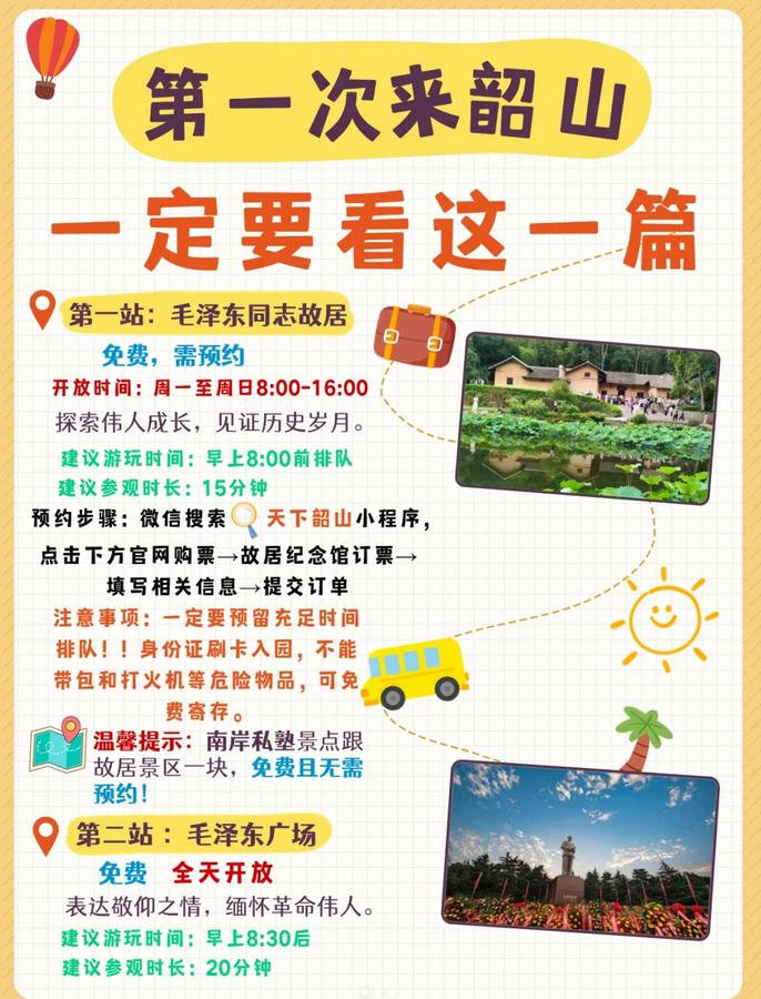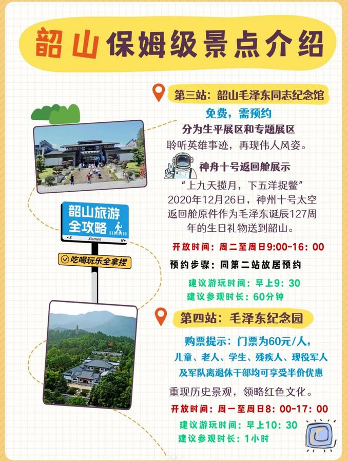 🎫门票预约:通过微信🔍“天下韶山”小程序,点击左下角的官网订票或故居纪念馆订票,填写相关信息并提交订单,凭身份证或门票二维码入园。