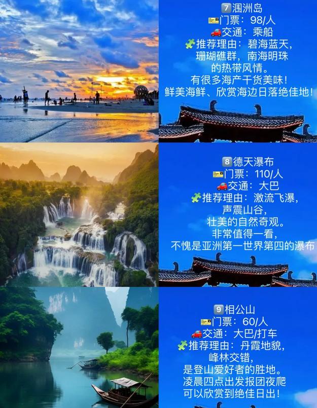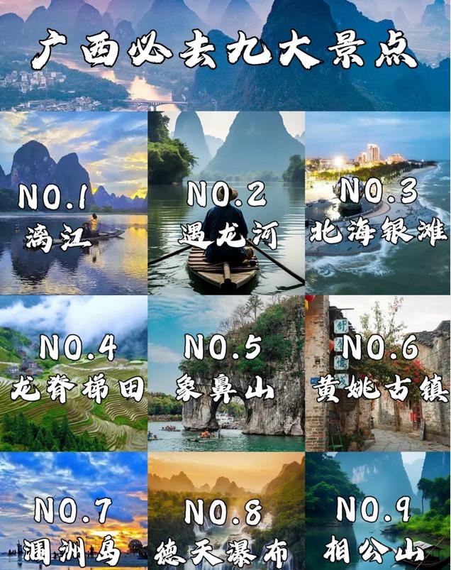 尽管我已经游览了不少地方,仍然觉得我的广西之旅攻略做得非常不错!这里整理了九个广西必去的景点,供大家参考,出行前一定要看看哦。 别忘了收藏哦!