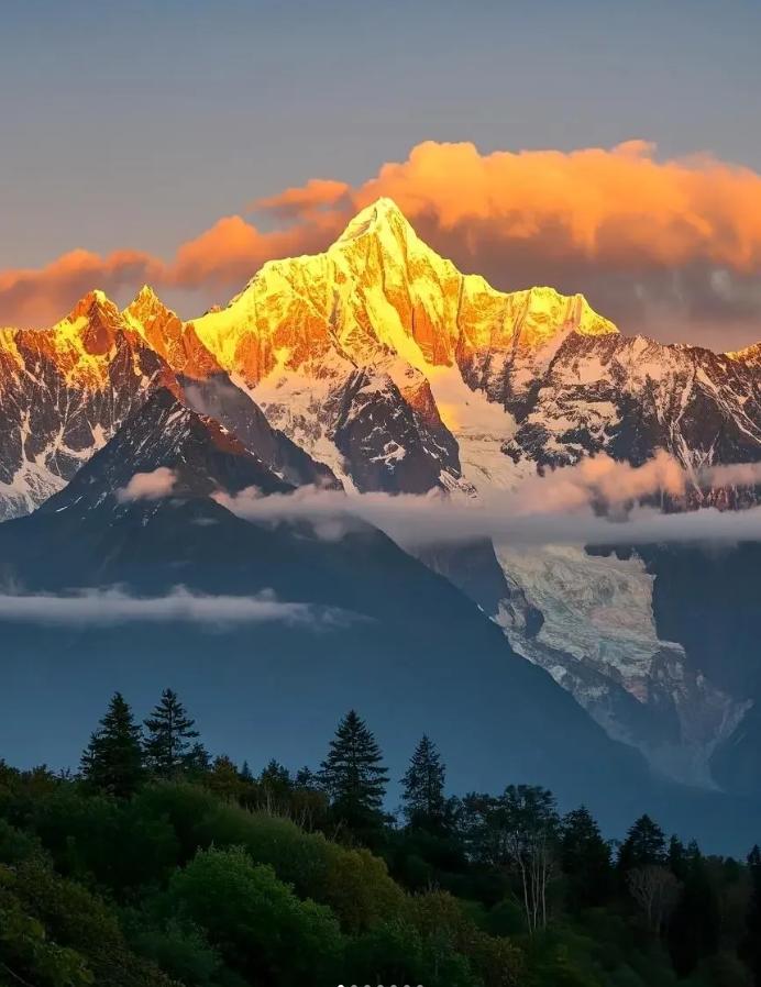 在黑暗中悄然出发,清晨的观景台上我瑟瑟发抖,然而当第一缕阳光洒向卡瓦格博峰时,我深知这一切都是值得的。金色的光芒从山尖蔓延开来,宛如天空撒下的金粉,逐渐覆盖整座雪山,显得神圣而梦幻,仿佛心灵也得到了洗涤。
