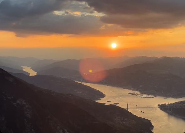 三峡的日落美得令人陶醉,仿佛是“长河落日圆”的真实写照。中秋节期间前往重庆,天气依然炎热,未带长袖衣物,没想到在三峡之巅的风竟如此寒冷,最终选择提前离开。