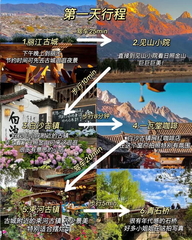 丽江古城➡️见山小院欣赏日照金山➡️白沙古镇➡️崎峙咖啡➡️束河古镇➡️青龙桥