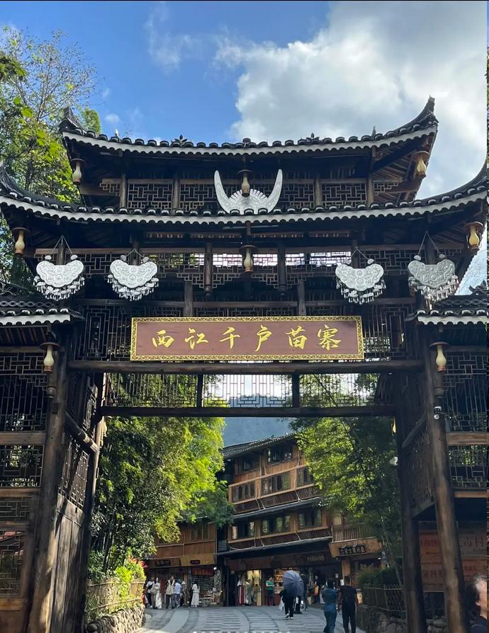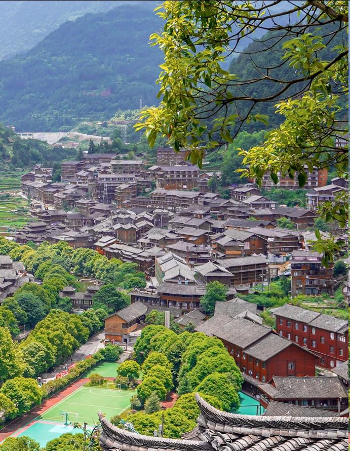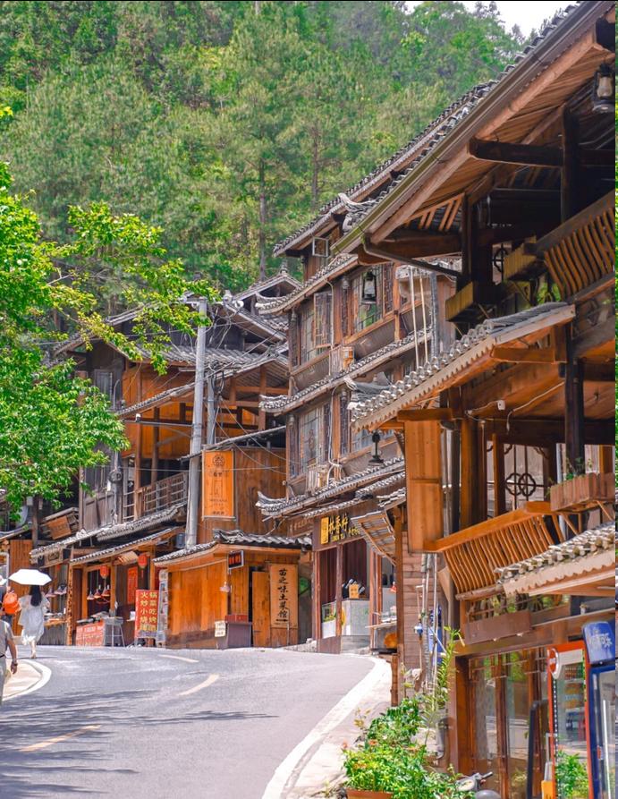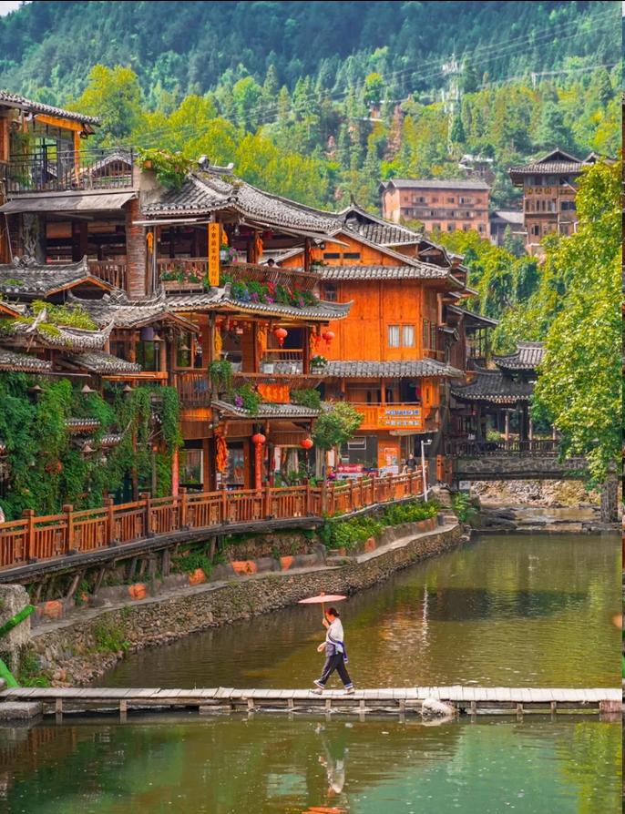 🎑景区介绍:苗寨坐落于两座山之间,山上分布着民居与客栈,山下的主干道旁流淌着河水,河上有七座风雨桥,全景观景台仅有一个(位于山顶)