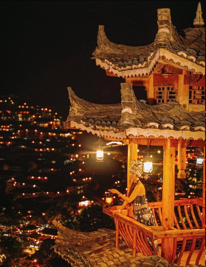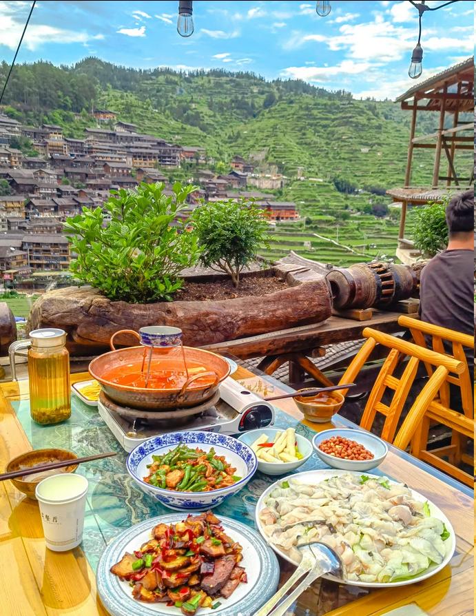 “山房餐厅”的观景台可以俯瞰整个苗寨的美景,边用餐边欣赏风景真的别有一番风味~而且一定要尝试他们的酸汤牛肉火锅!!
