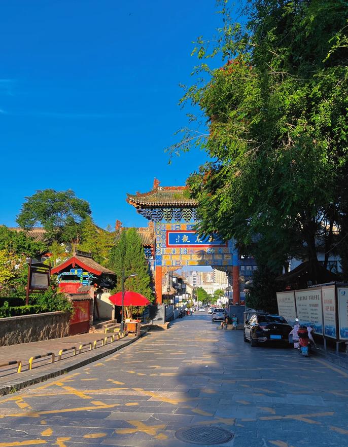 🕡 下午五点多,离开伏羲庙后导航前往玉泉观,过马路时可以看到小布达拉宫,顺便拍张照片即可。到达玉泉观时已是晚上六点,基本没有游客,道观显得十分安静,可以直接进入参观。我个人非常喜欢玉泉观,夕阳洒在道观上,伴随着钟声,心情格外愉悦。