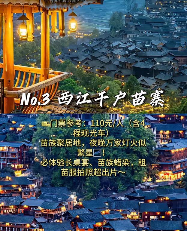 特色:苗族的聚居地,夜晚的灯火如繁星点点!一定要体验长桌宴和苗族蜡染,租借苗服拍照更添风情~