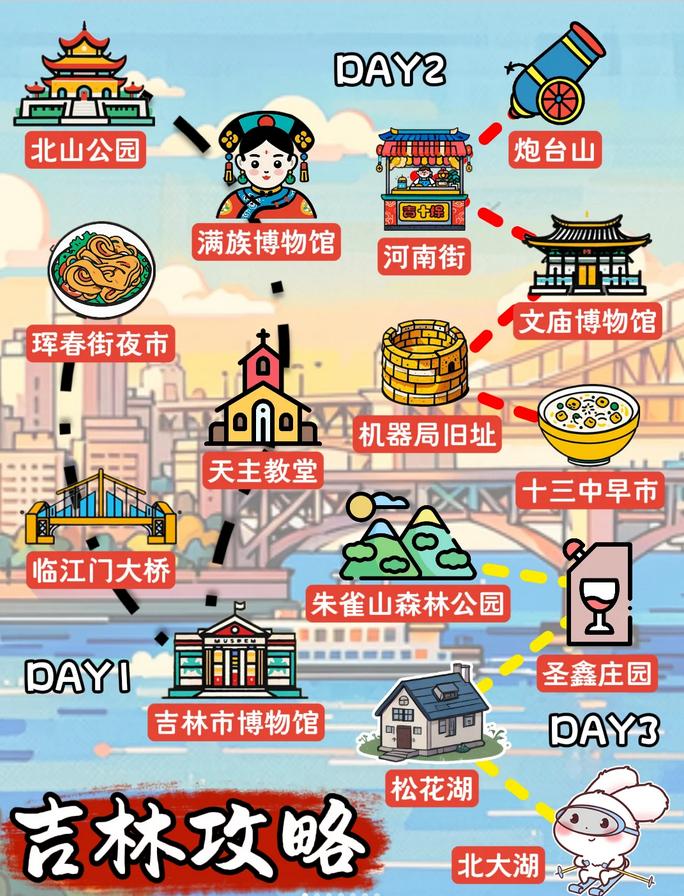 Day1:北山公园→吉林市满族博物馆→天主教堂→五代世纪广场/玉山路→吉林市博物馆→临江门广场→珲春街夜市
