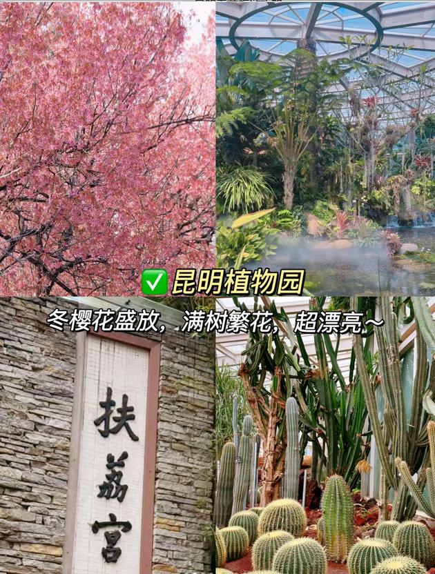 🌳 首先前往昆明植物园,正值冬樱🌸盛开,满树花朵,色彩斑斓,漫步其中仿佛置身于梦幻的世界。别忘了去百草园,了解各种珍稀植物,感受自然的魅力。