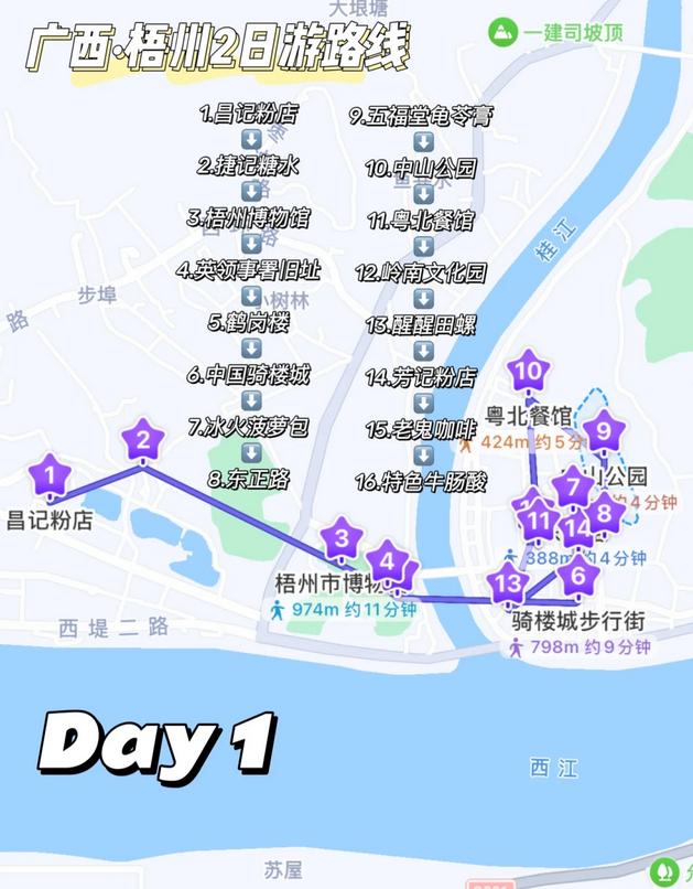 昌记粉店➡️捷记糖水➡️梧州博物馆➡️英领事署旧址➡️鹤岗楼➡️中国骑楼城➡️冰火菠萝包➡️东正路➡️五福堂龟苓膏➡️中山公园➡️粤北餐馆➡️岭南文化园➡️醒醒田螺➡️芳记粉店➡️中国骑楼城➡️老鬼咖啡➡️特色牛肠酸➡️永昌堂