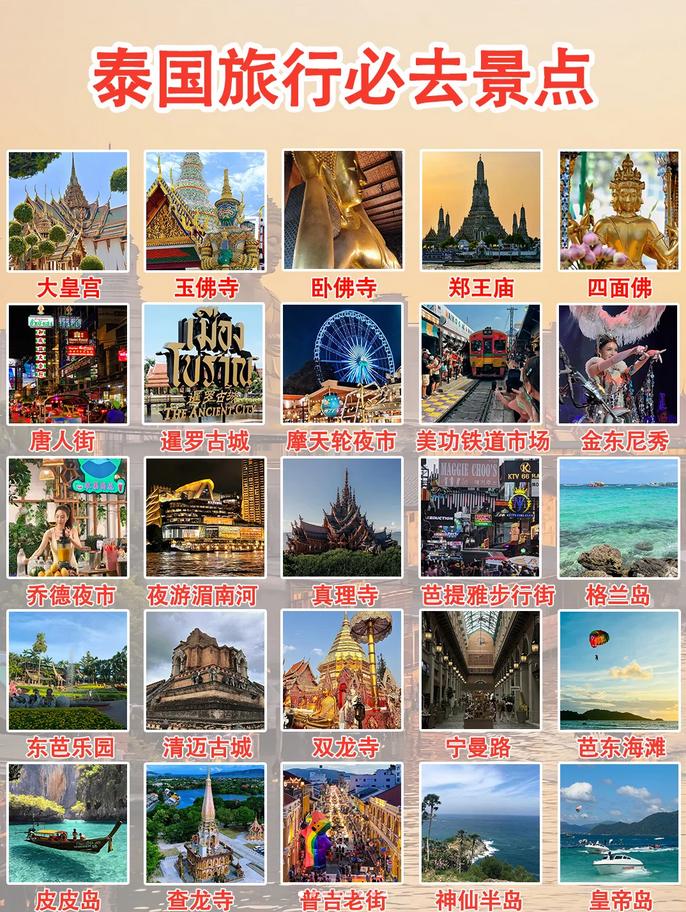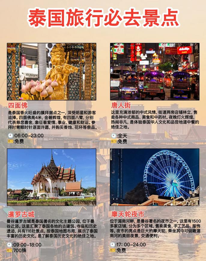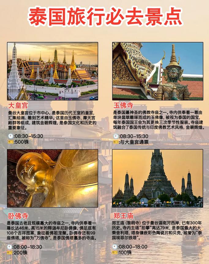 🕋 卧佛寺:这是泰国最大的寺庙之一,内部有一尊巨型卧佛,也是泰式按摩的发源地。