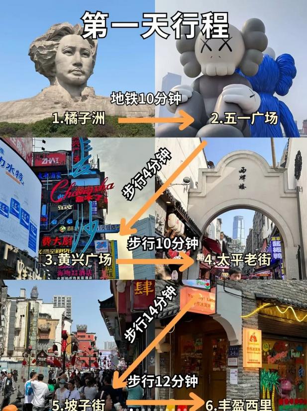 橘子洲➡️五一广场➡️黄兴广场➡️太平老街➡️坡子街⚠️建议在橘子洲购买小火车票,价格为40元,方便来回!因为步行的距离会比较远!