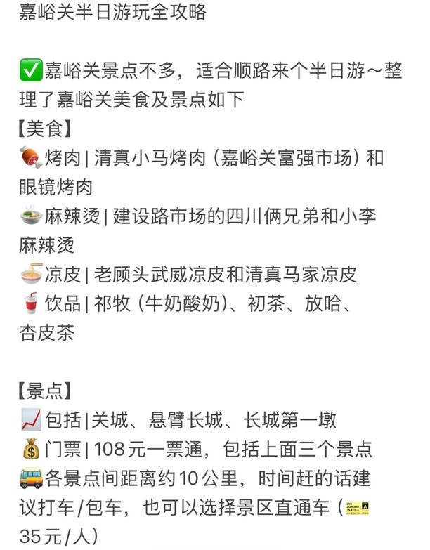 我的行程是【张掖➡️嘉峪关➡️兰州】。在嘉峪关游览了关城和悬臂长城,并享用了凉皮和烧烤,停留时间为7️⃣小时,以下是我的行程参考。